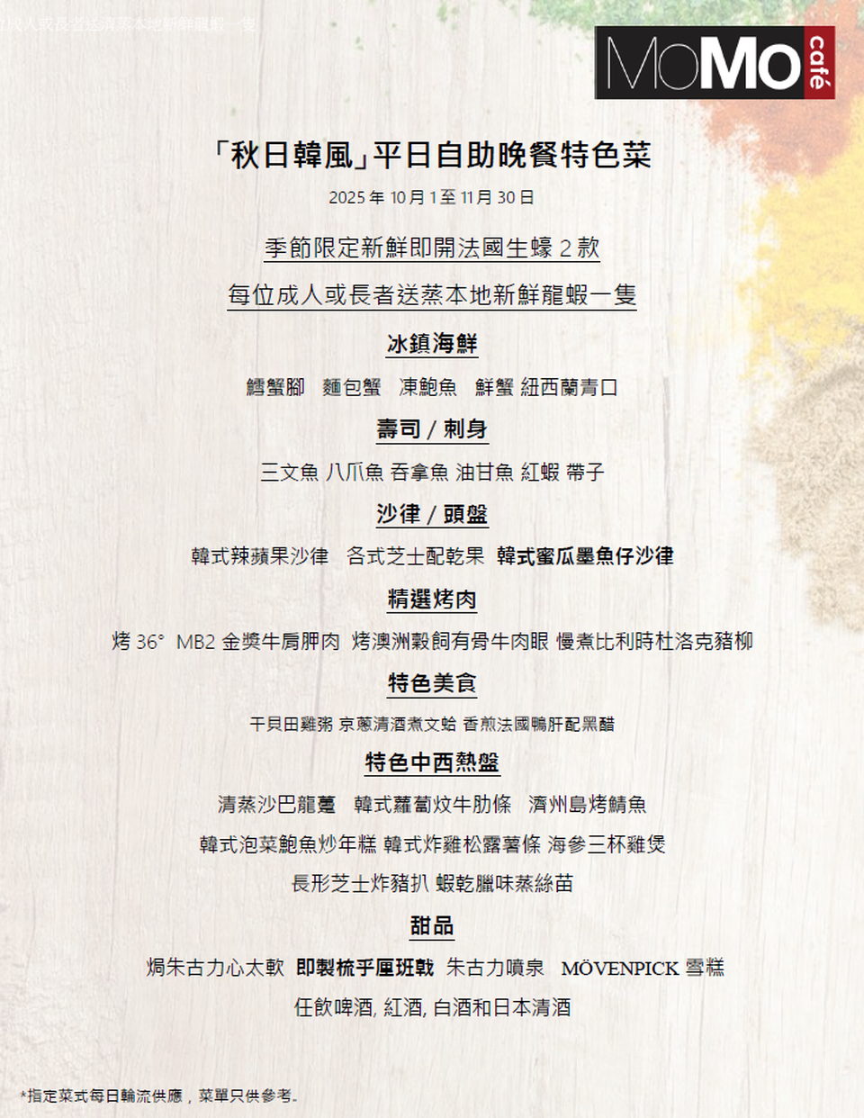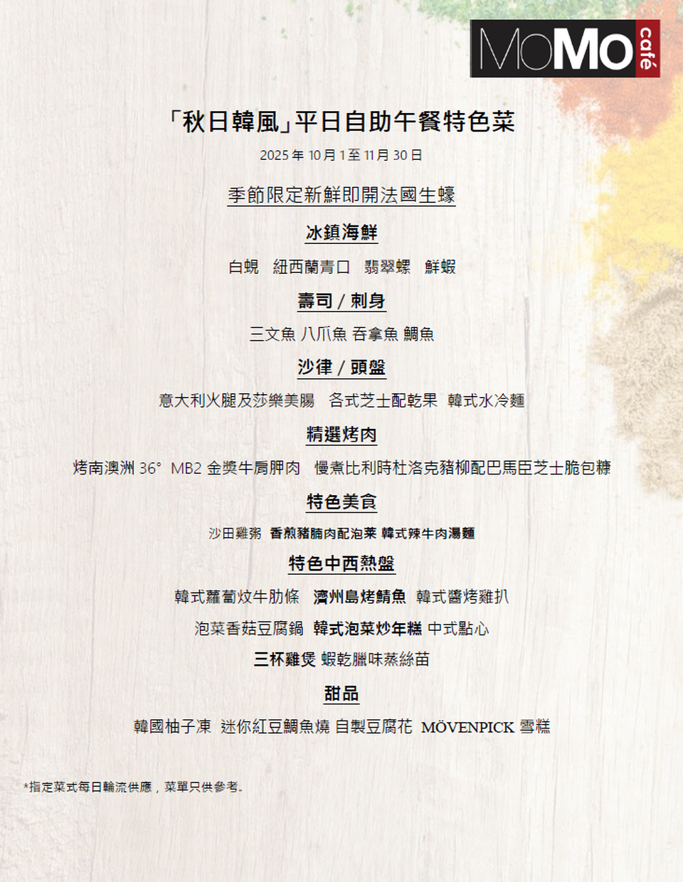 MoMo Cafe屬於沙田萬怡酒店旗下餐廳,提供豐富自助午餐和自助晚餐。自助午餐以國際美食為主題,提供多元化環球美食和甜品。晚餐更有豐富海鮮和熟食選擇。