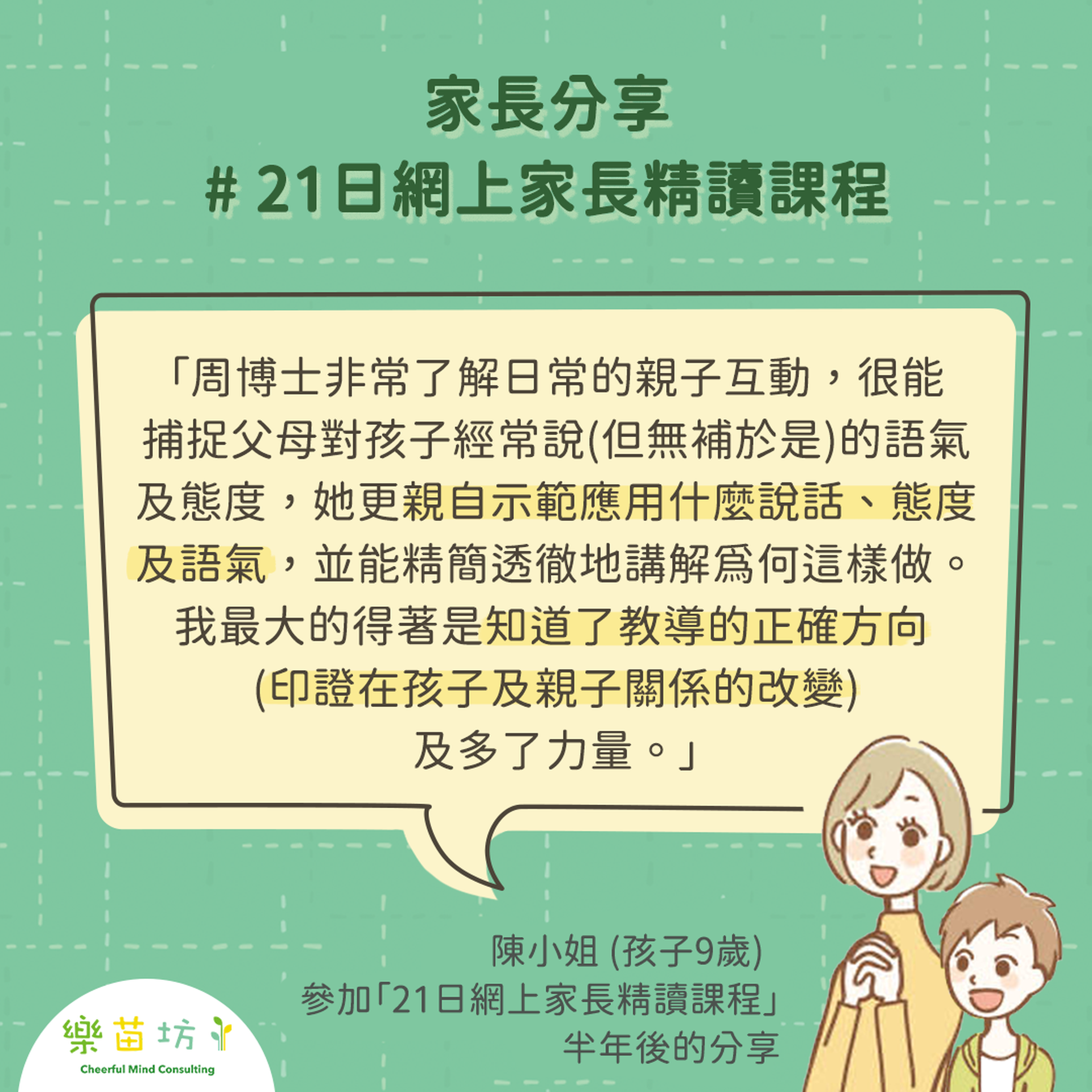 「21日網上家長自學課程」是周婉芬博士(樂苗坊總監及註冊心理學家)獻給忙碌家長們的一套自學課程,系列有3個主題課程,全面涵蓋教養孩子技巧,協助家長改善孩子的行爲及情緒問題,教出自律、情緒管理能力佳的孩子,再加上伯樂父母給子女注入學習動力,孩子更能盡展學習潛能。此課程全程在網上進行,讓參加者在 21 日內隨時觀看課程內容,靈活安排時間學習。