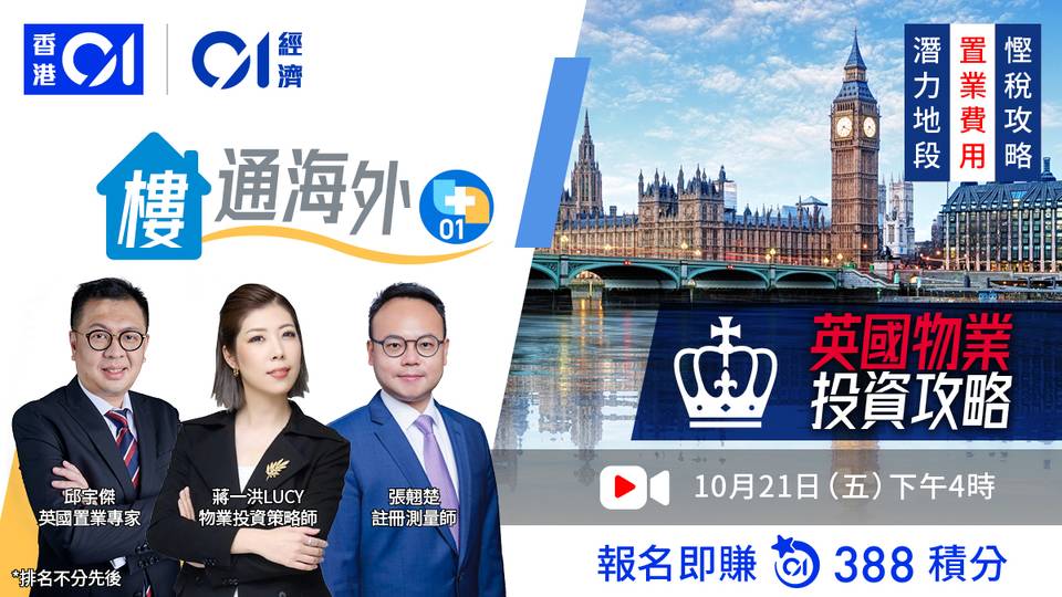 「01會員」於「01空間」報名參加「樓通海外+01 - 英國物業投資攻略」即可賺388「01積分」,數量有限,先到先得,送完即止。*活動受條款及細則約束。