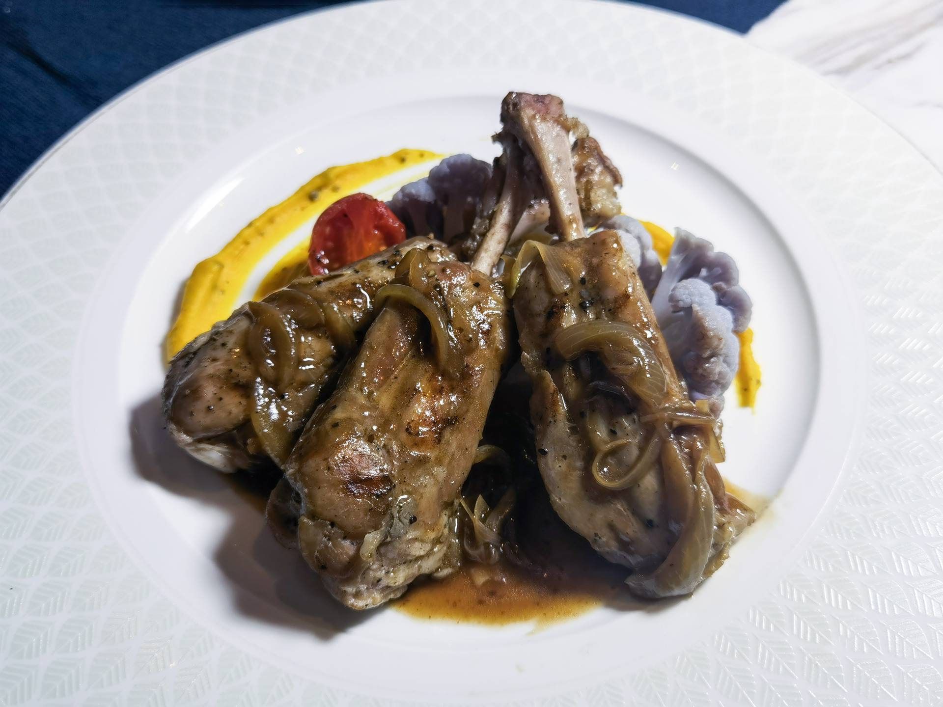 豬⼨⾻配⽩松露南⽠泥、椰菜花及⿊啤洋蔥汁
