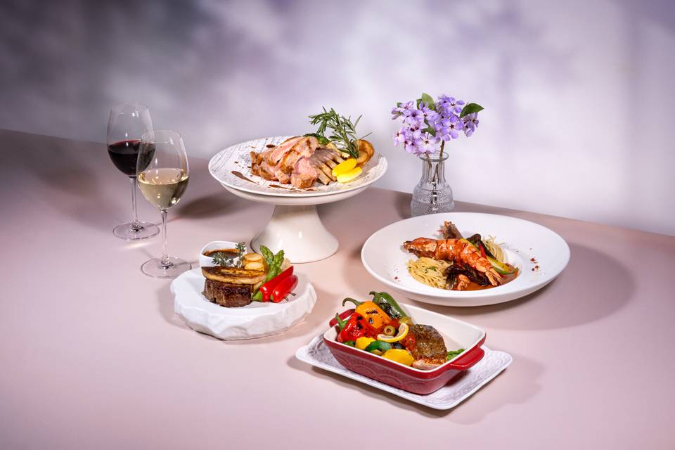 包括自助沙律吧、意大利前菜、熱食薯菜區、餐湯、一款主菜及咖啡或茶