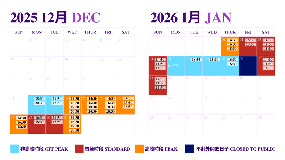 非高峰時段 適用於:12月22-23日/1月5-8日