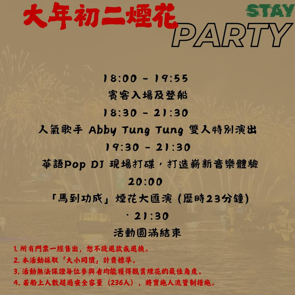 ⏰ 時間: 18:00 - 21:30 (煙花匯演約20:00開始)