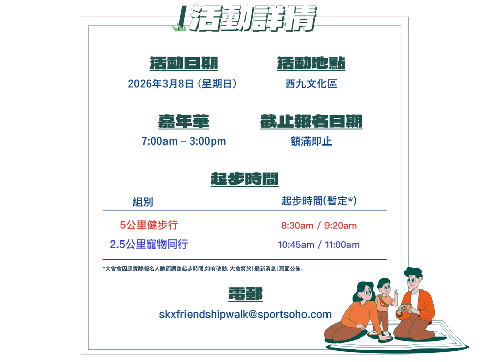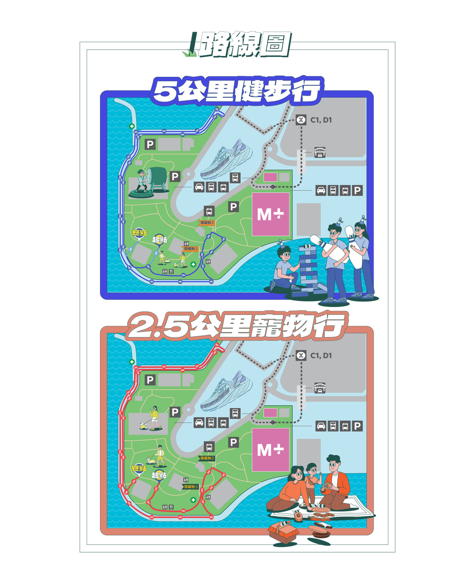 活動將於西九文化區藝術公園大草坪舉行,包括5公里健步行及2.5公里寵物行組別,分別設個人組、孖住組及家庭組,報名組合更加靈活!另外,路線中亦特設健步行挑戰站,讓參加者邊行邊玩,更添趣味!