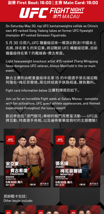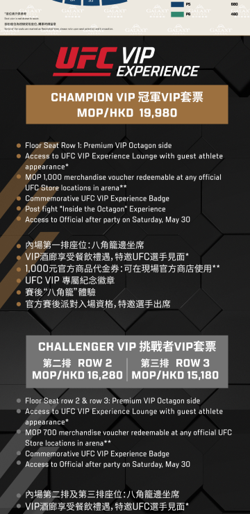 格鬥周期間,澳門銀河還將推出粉絲互動活動、UFC運動員嘉賓亮相以及遍佈度假城的主題體驗,為所有格鬥迷打造難忘的沉浸式賽事盛會。