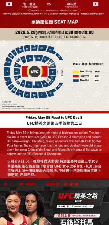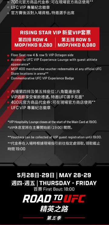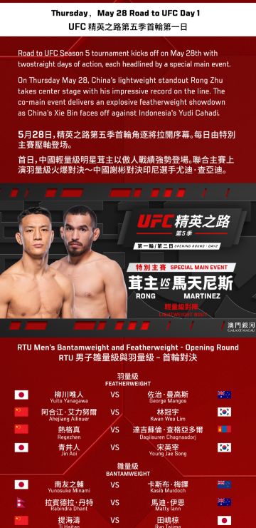 在UFC格鬥之夜壓軸之前,兩場UFC精英之路賽事將於5月28日及29日率先舉行。兩晚賽事均設有特別主賽對決,並將拉開第五賽季淘汰賽的大幕,32位來自亞太地區的頂尖MMA新秀將展開激烈角逐,爭奪通往UFC門票。