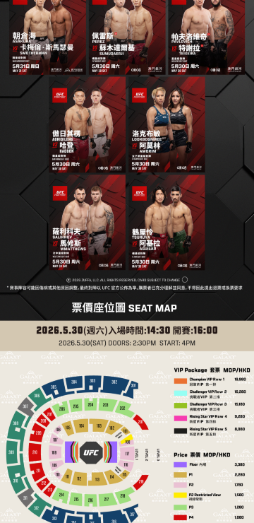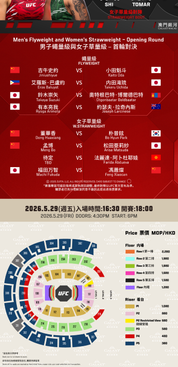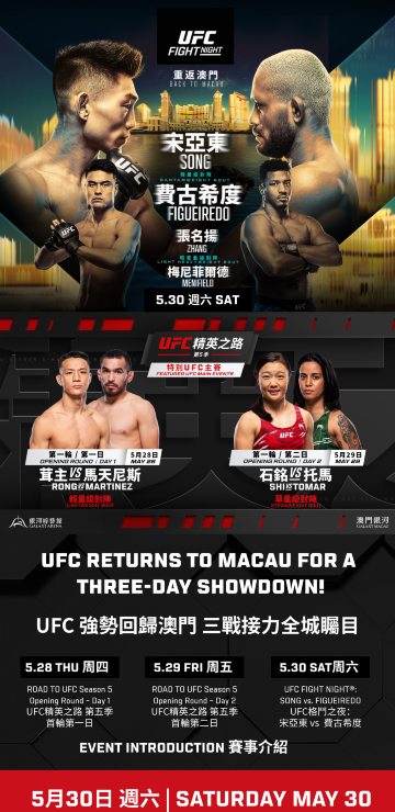 2026年5月28日至30日,全球頂級綜合格鬥組織 Ultimate Fighting Championship 將重返澳門銀河的銀河綜藝館,連續三日呈獻精彩賽事,打造熱血沸騰的UFC格鬥周。